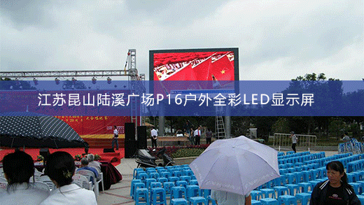 江蘇昆山陸溪廣場P16戶外全彩LED顯示屏由智彩科技定制、安裝。產品型號:P16全彩屏,面積:50平方米。